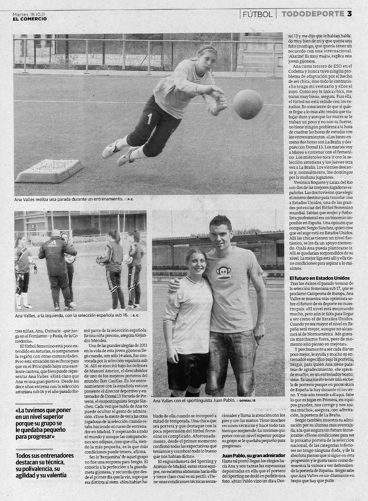 octubre 20, 2011Sabíamos sobre el reportaje y hoy ha visto la luz. Ana Valles, alumna de Dorsal13 Escuela de Porteros, es la protagonista de uno de los artículos del suplemento Tododeporte que edita EL DIARIO EL COMERCIO. También podemos ver en la foto de portada a algún portero más de la escuela como Javi, Illán, Guille….