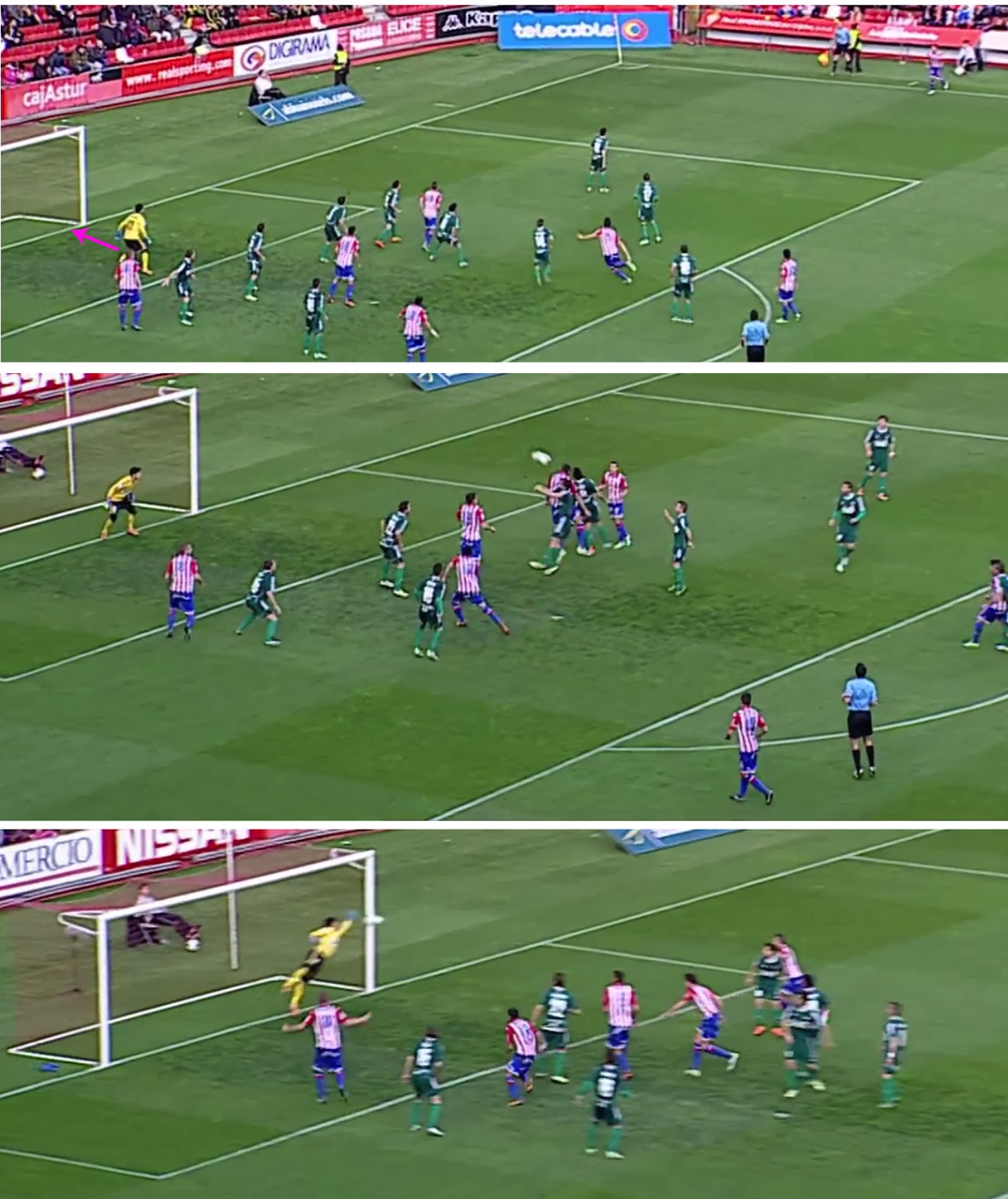 Podemos ver en los clip como Roberto parte de una posición adelantada, a sabiendas que el Sporting en balones de saque de banda cercanos al área aprovecha el buen saque de Luis Hernández para colgarlo, esa posición adelantada le ayudaría a una posible salida aérea para desbaratar la acción. Posteriormente decide no participar en la acción aérea y REPLIEGA hacia portería con el fin de ganar distancia y aumentar el tiempo de reacción respecto al posible remate.